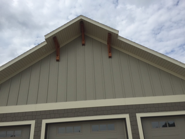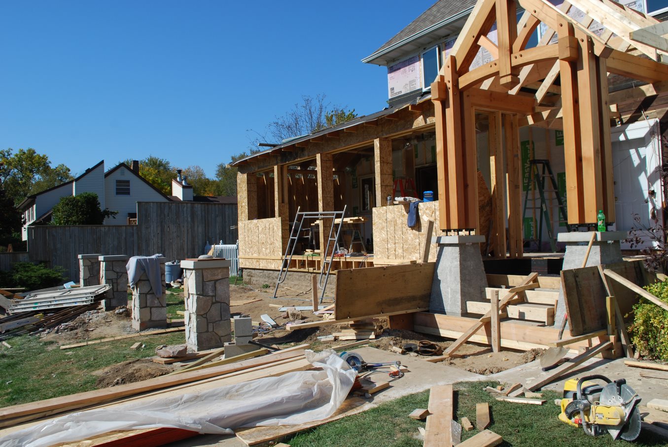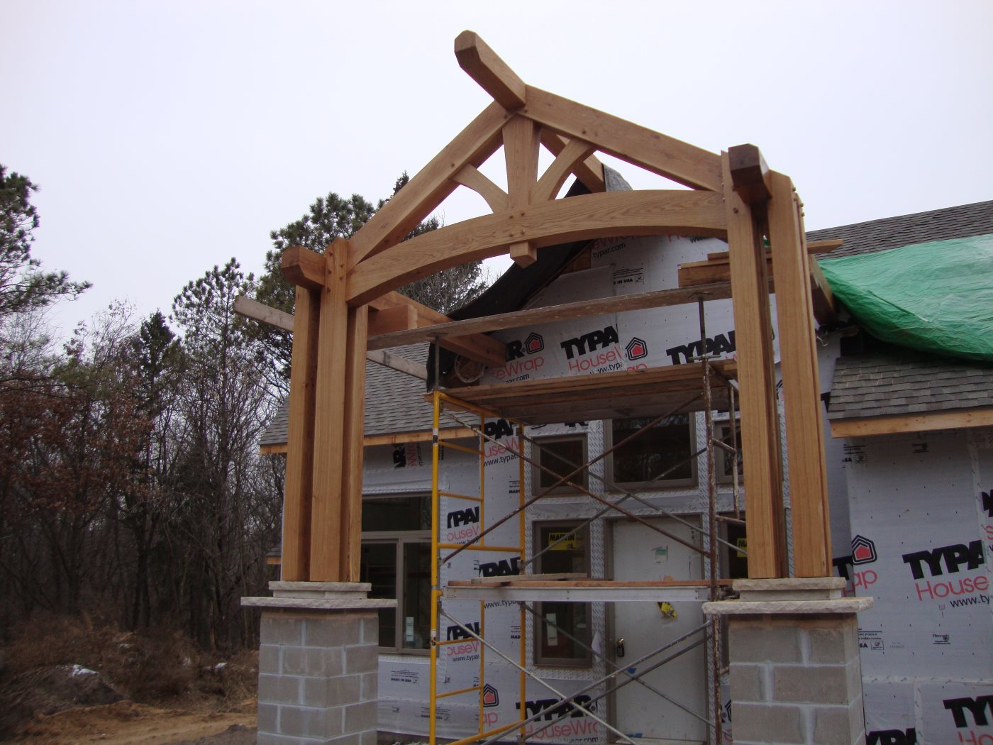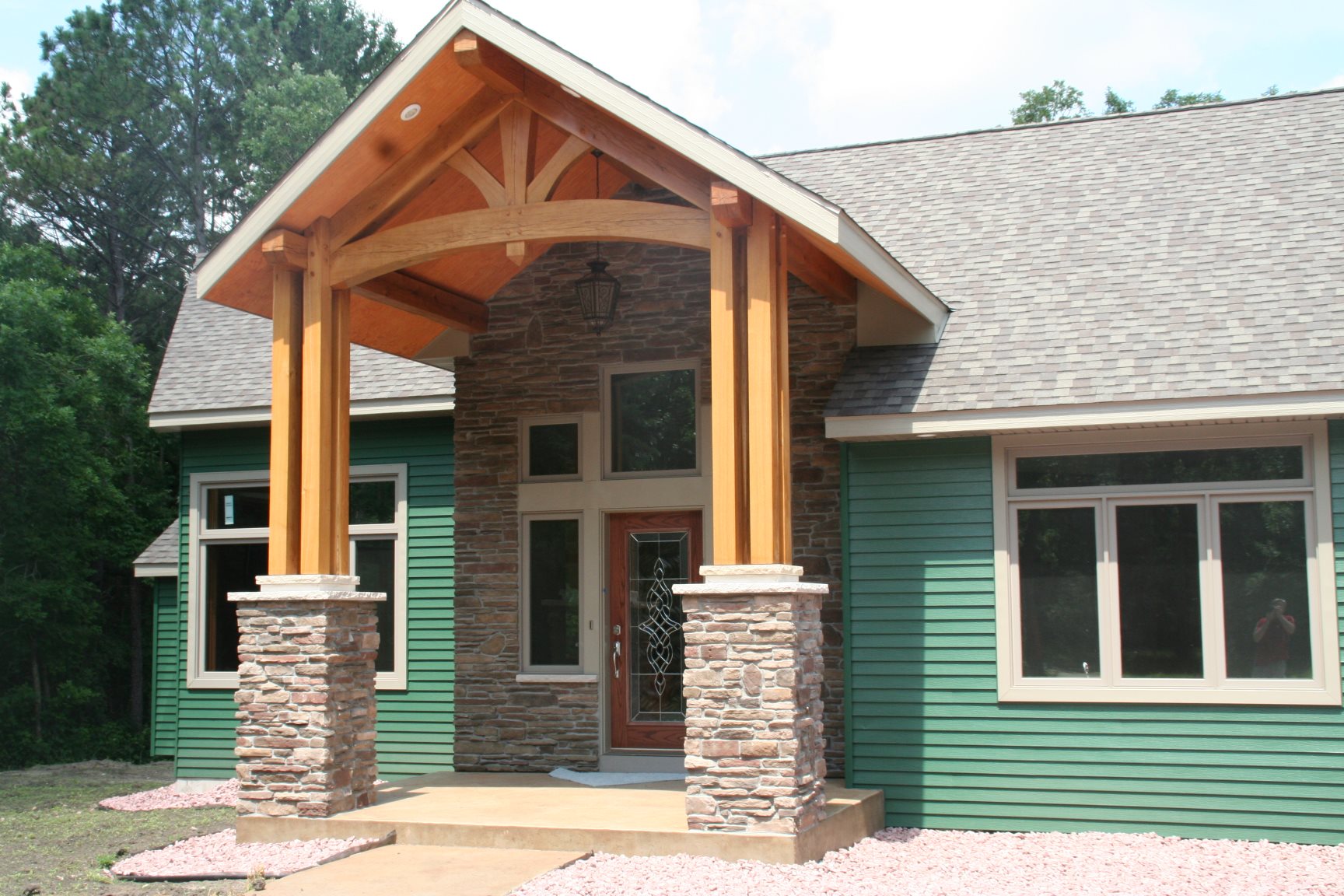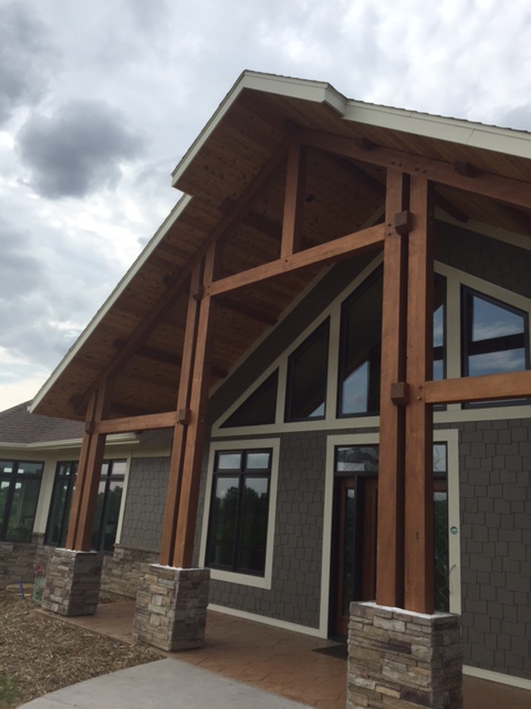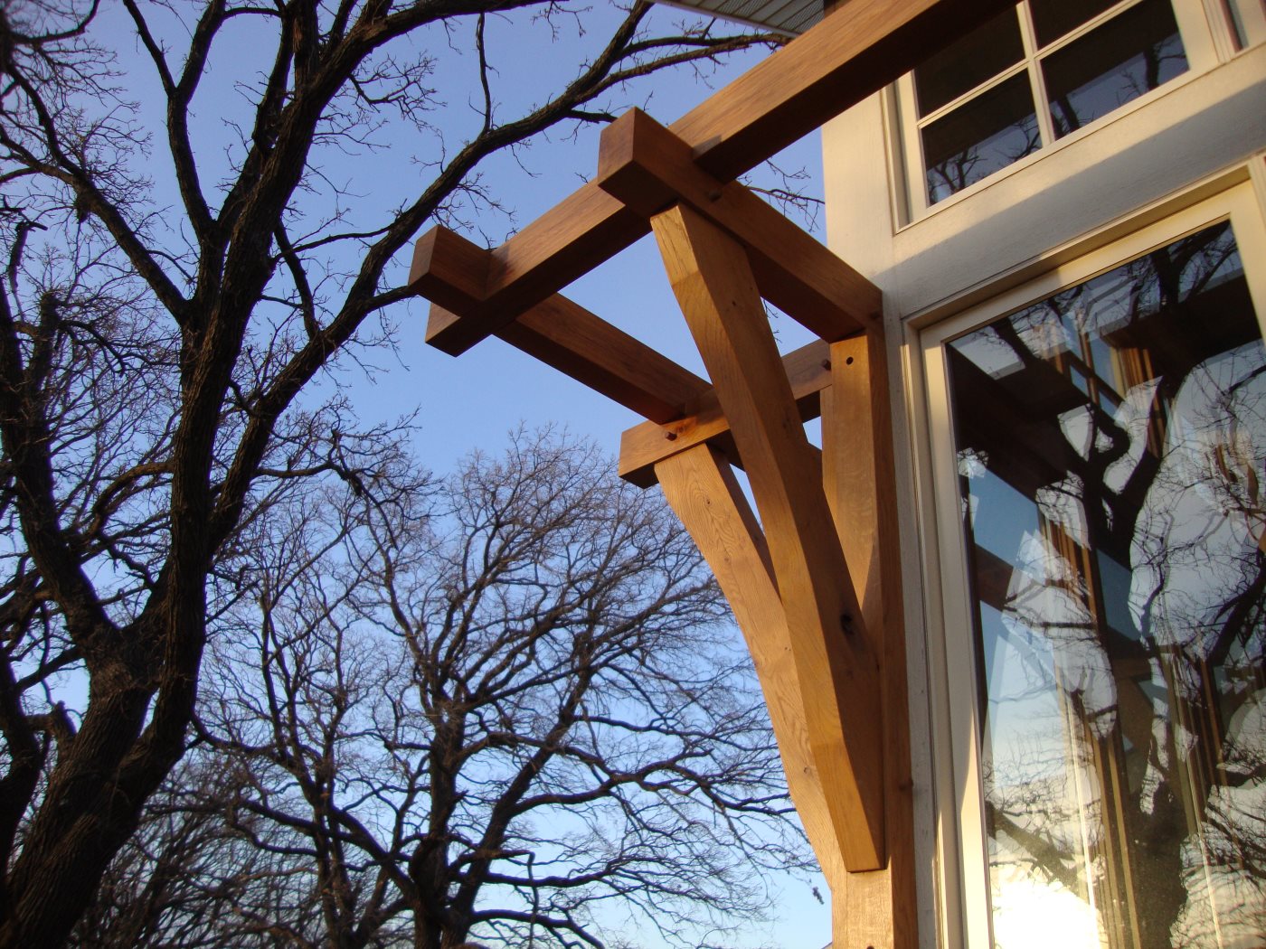 Exterior entry and brackets of white oak. Interior non-structural posts and beams are new douglas fir.