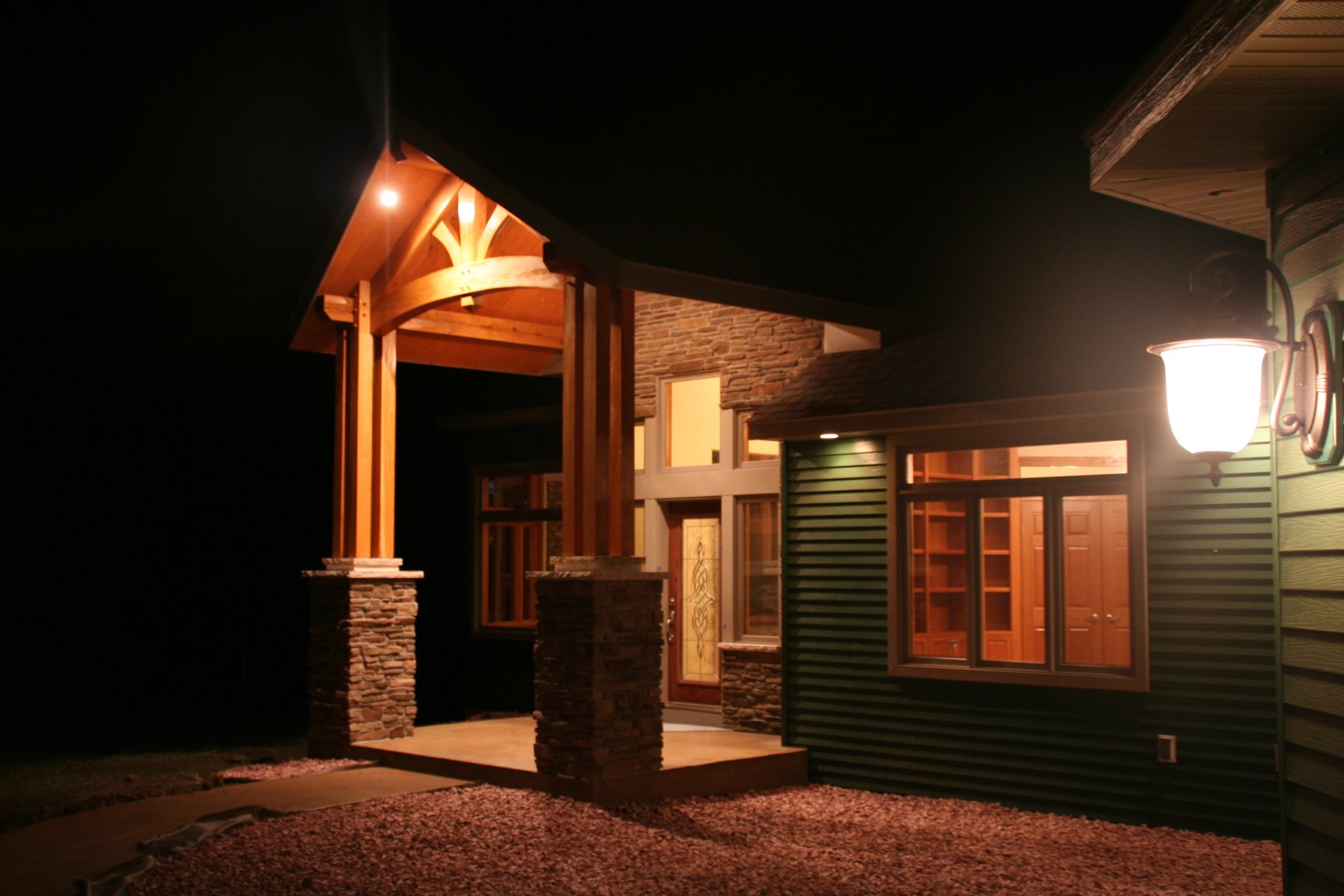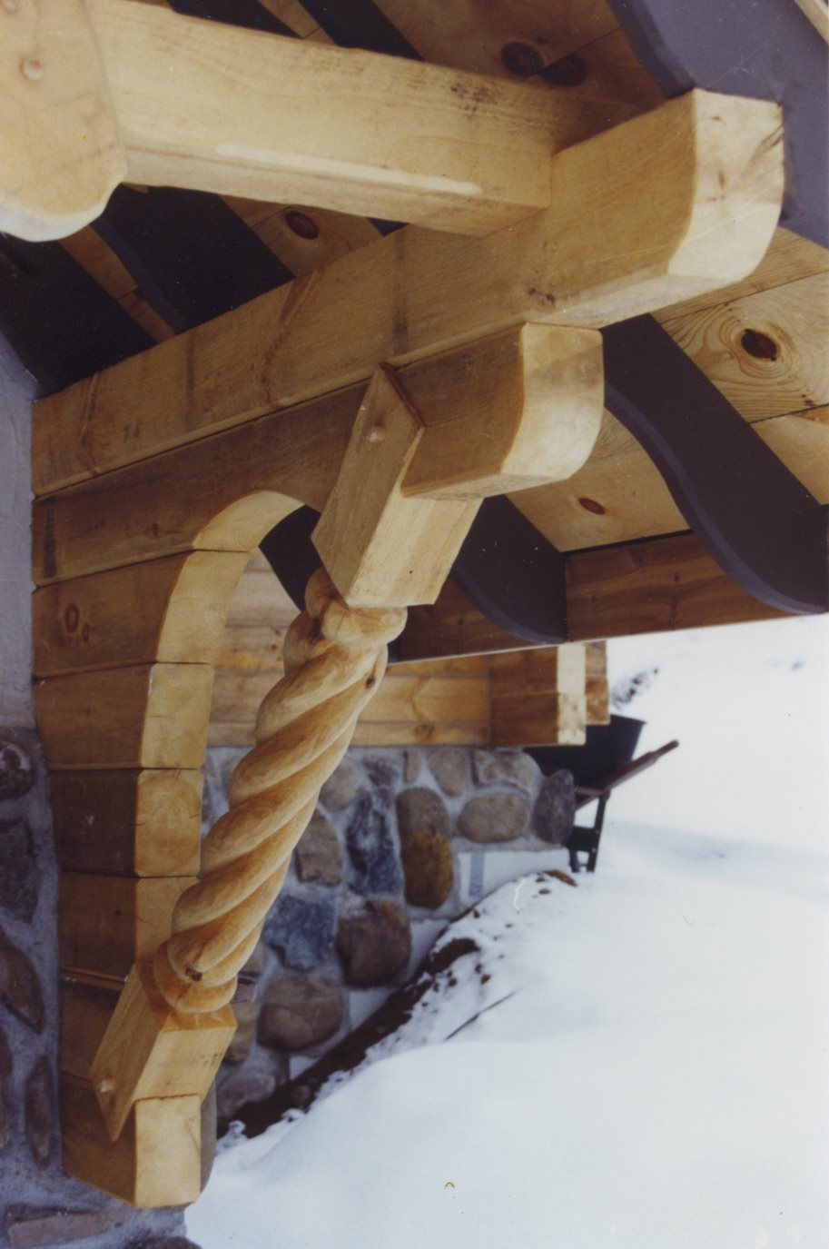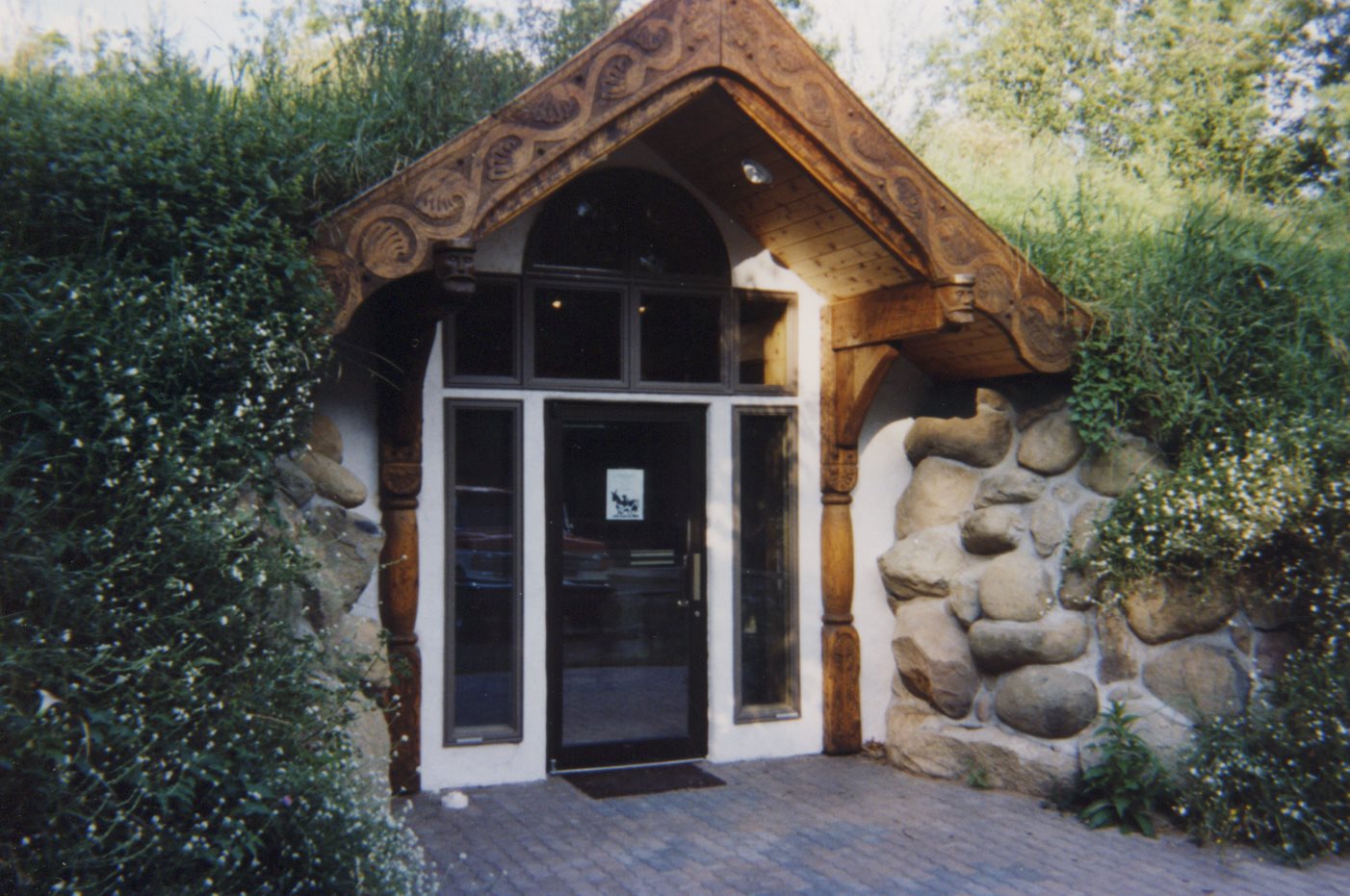 Entry built to match stacked wall cottage. Curved timber work and rope carved bracing taken from old European designs. Underground vet clinic inspired by Holmenkollen Hotel in Olso, Norway.
